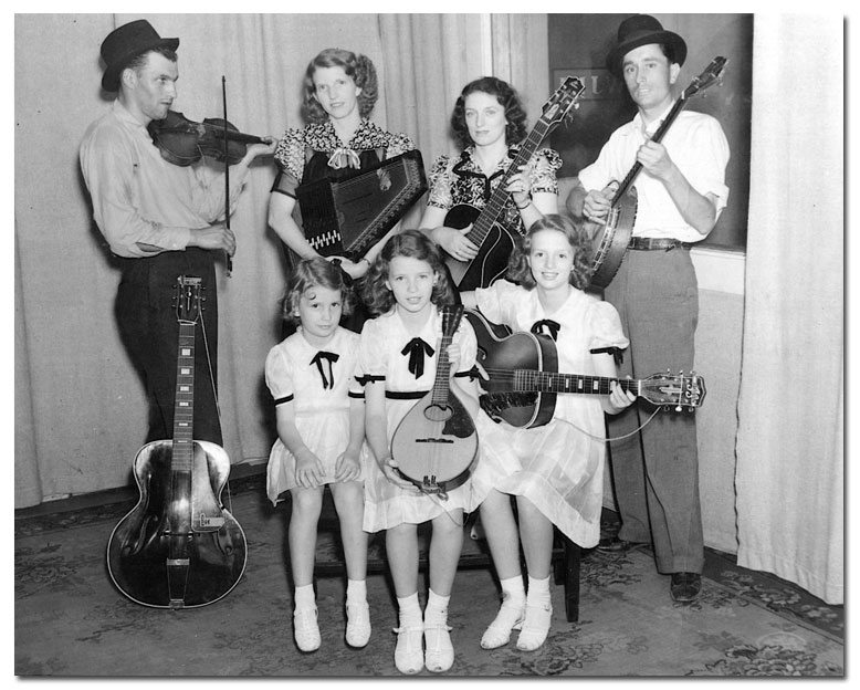 Photo from around 1940; Left to Right: Maybelle Carter's brother, Hugh Jack "Doc" Addington (fiddle/guitar), A.P. Carter's sister, Sylvia Carter (autoharp), "Mother" Maybelle Addington Carter (guitar), Maybelle's 2nd cousin, Carl P. McConnell (banjo), Anita Carter, June Carter (mandolin), Helen Carter (guitar).